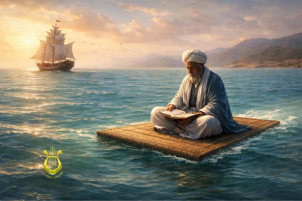 Капитан, увидев это, решил, что еврей сейчас будет попрошайничать, чтобы насобирать сумму на путешествие — но тот ни разу не оторвал глаз от книги. Некоторые из поднимавшихся на борт спрашивали у капитана о странном еврее, нашедшим такое неподходящее место для учебы — и тот рассказывал с усмешкой о «бедном еврее», решившем «за просто так» переправиться в Турцию в обществе «правоверных». На удивление всех, следивших за развитием событий с борта корабля, когда подняли трап, то «яхуд» («еврейчик» на арабском) не стал прыгать и умолять взять его на борт. Он просто встал, взял свой коврик в руки и, подождав, когда корабль отчалит, положил коврик на воду и сел на него сверху. Коврик не только не пошел с бульканьем под воду — а стал плыть рядом с кораблем. Пассажиры судна позвали капитана. Тот, увидев такое чудо, понял, что имеет дело с еврейским праведником — а все арабы знали их силу. Капитал стал звать Рабби Шмуэля на борт, но тот не обращал на него никакого внимания. Так они доплыли до берегов Турции. В порту Рабби Шмуэль на глазах изумленных матросов, грузчиков и другой публики подплыл на коврике к берегу, встал, взял коврик. И, стряхнув с него воду, неспешно пошел в сторону еврейского квартала.